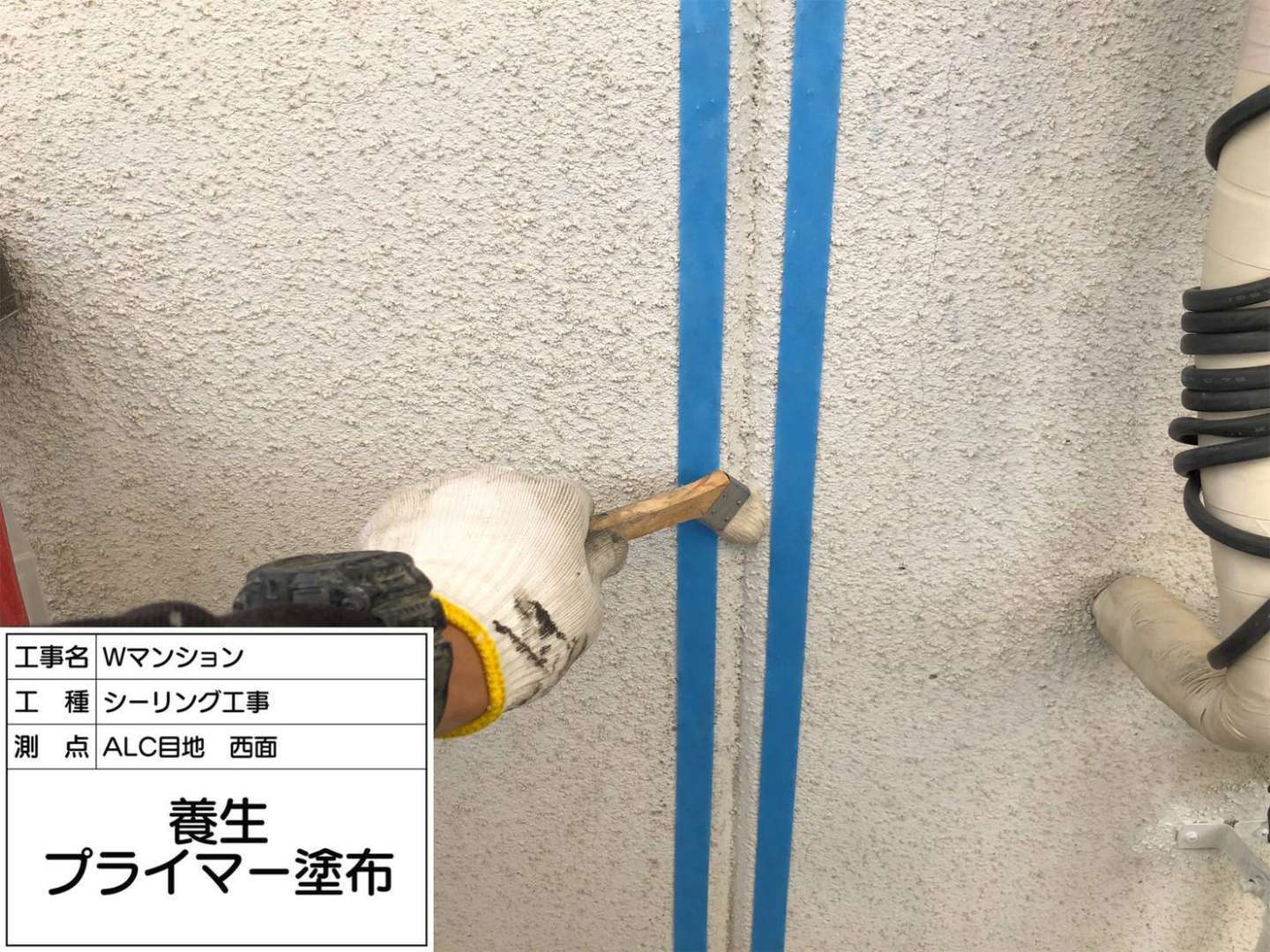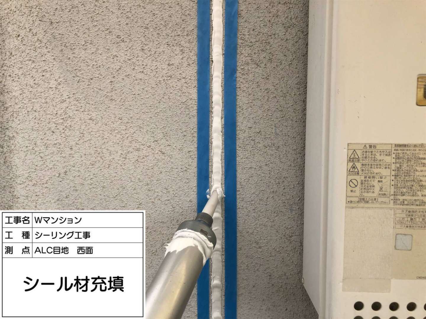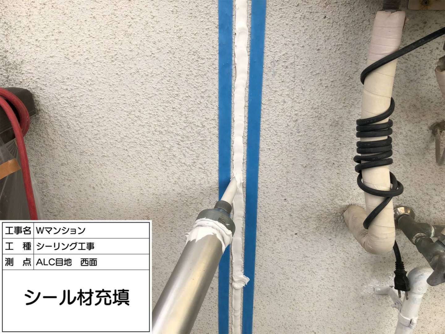 西面外壁のシーリング充填など一連の作業風景です。