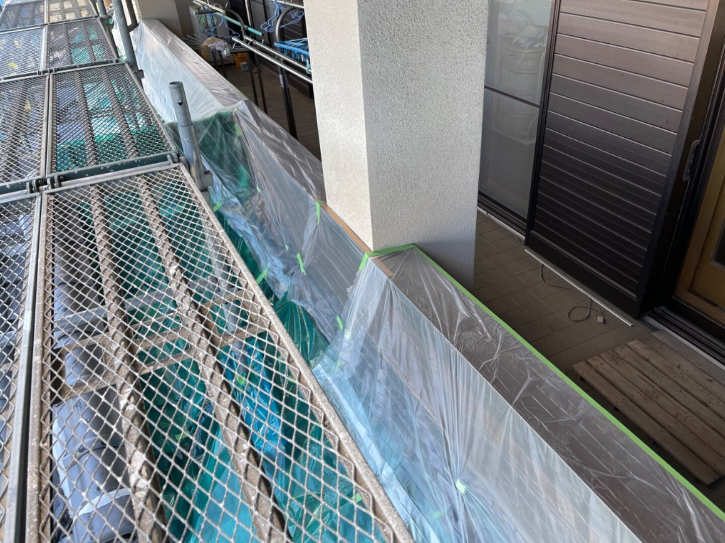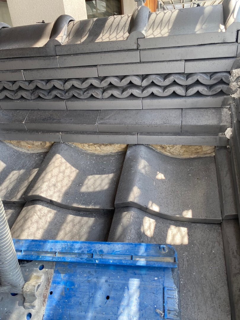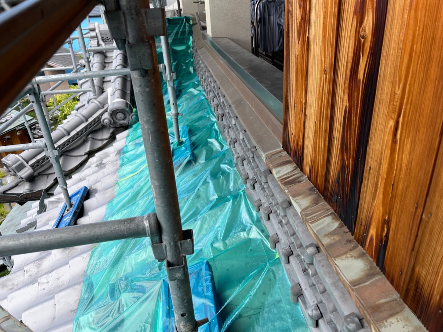 今日の吹田市N様邸の屋根漆喰塗り替え、塗装の養生、シーラー塗りです